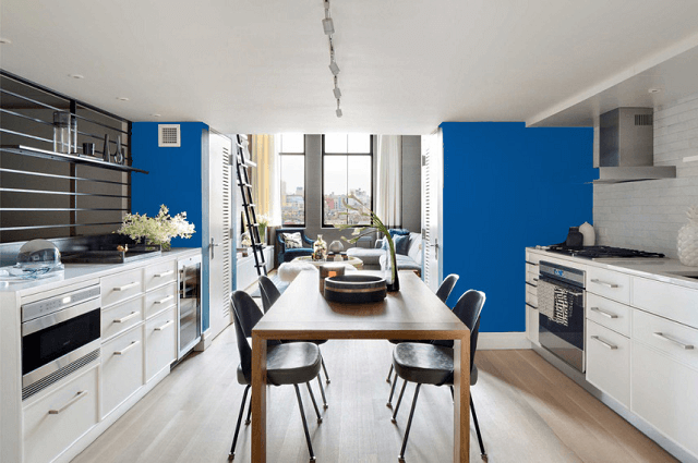 相近色深蓝色+公主藍+对比色橙色灯罩点缀,空间饱满而不乱,沉静中带点活泼,一切刚刚好。