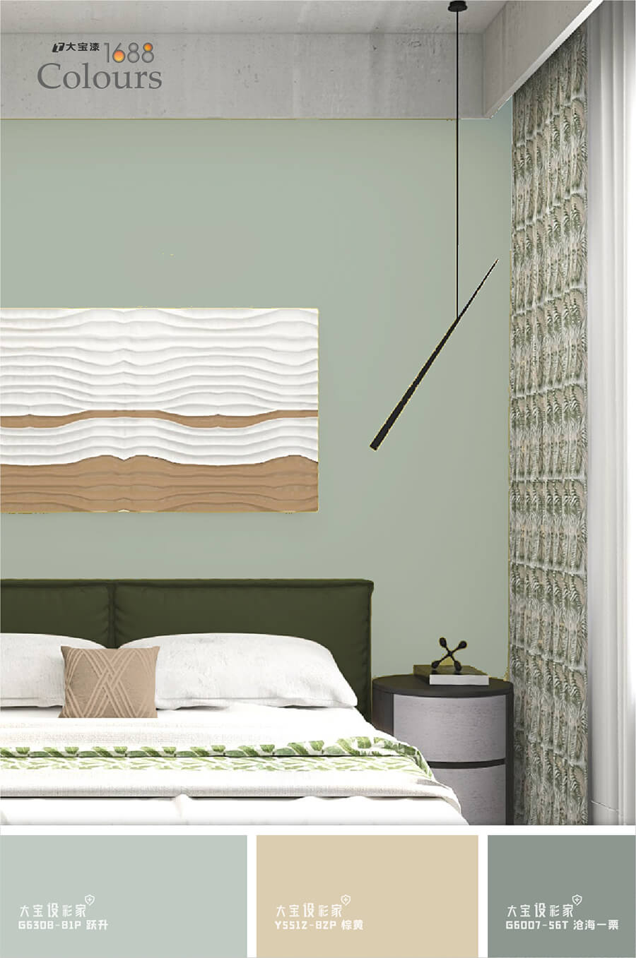 灰绿的莫兰迪色在空间中百搭零失误,运用在卧室空间会更舒服稳重,大宝荷采绿(G4940-30A)赏心悦目的颜色,富有治愈气息,可以作为大量的墙面色彩使用,也可以用橱柜 樱花视频在线,茶几,床组等软装作为色彩载体进行局部性点缀,不仅可以点亮空间,还能带来清爽自由, 。