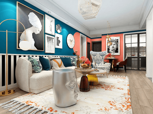 像是上面的个案,整体走的是宁静幽雅的古典现代混搭风,厨房立面以古典元素为基底,创造出居家的舒适氛围;开放式餐厨区使用珊瑚橘的墙面抓住了低彩度空间的视觉焦点,增加活泼轻快的时尚元素。视觉上珊瑚橘先抓住了空间潮流多彩的性格,再传递能细细品味混搭的丰富层次。