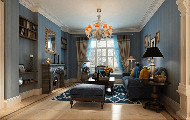 相近色深蓝色+公主藍+对比色橙色灯罩点缀,空间饱满而不乱,沉静中带点活泼,一切刚刚好。